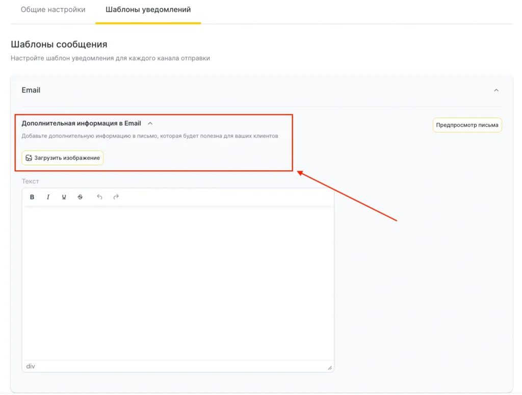 - Для канала Email редактирование шаблона недоступно, но можно добавить дополнительную информацию. Для этого: