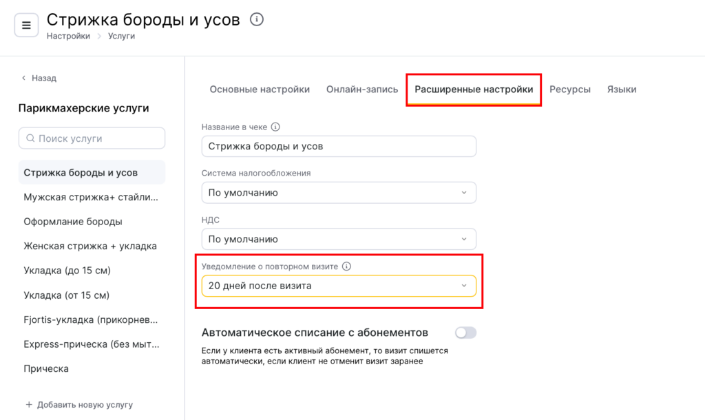 Вы также можете изменить настройки периода для каждой услуги в разделе Настройки > Настройки записи > Услуги на вкладке Расширенные настройки (подробнее о настройке услуг читайте в статье).