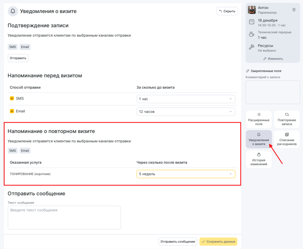 Уведомление отправится, если прошлая запись клиента на услугу находится в статусе Пришел.