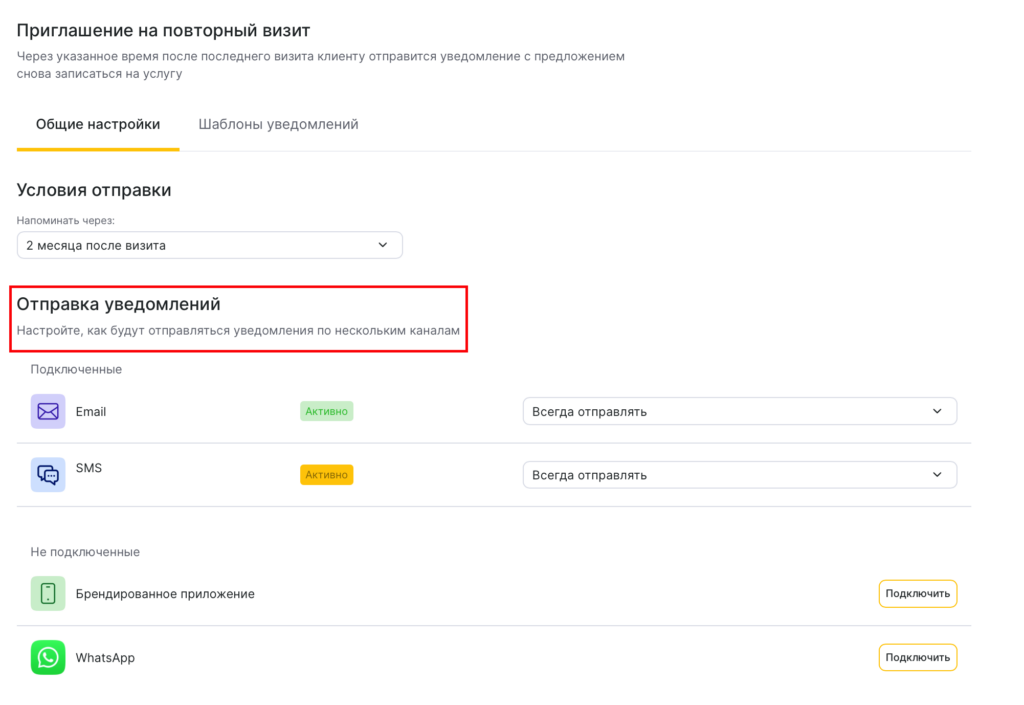 Автоматическое сообщение с предложением снова совершить визит. Уведомление будет отправляться, если в течение указанного периода клиент не совершил запись в компанию на услугу. Проверка будет идти по каждой услуге. Если по двум услугам периоды уведомления совпадают, то по ним будет отправлено одно уведомление с указанием этих двух услуг.