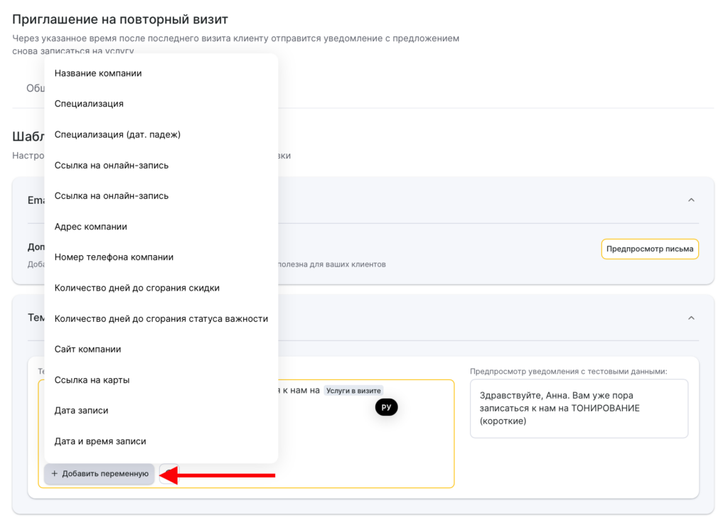 - Для настройки SMS-шаблона доступны переменные, вместо которых будут автоматически выводиться данные о визите, услуге, клиенте или филиале. Чтобы добавить переменную в шаблон, нажмите на кнопку Добавить переменную, затем выберите подходящую по смыслу. Список всех доступных переменных можно найти в статье.