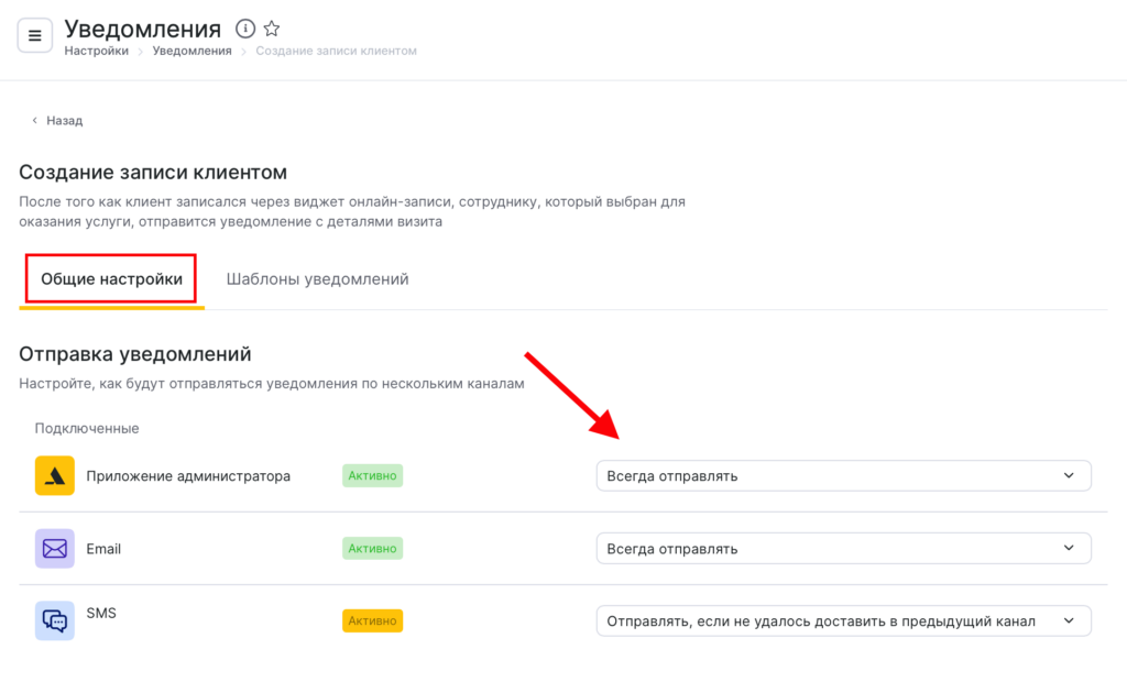 - На вкладке Общие настройки настройте, как будут отправляться уведомления по нескольким каналам. Подробнее о сценариях отправки уведомлений по разным каналам читайте в статье. Доступные каналы отправки: