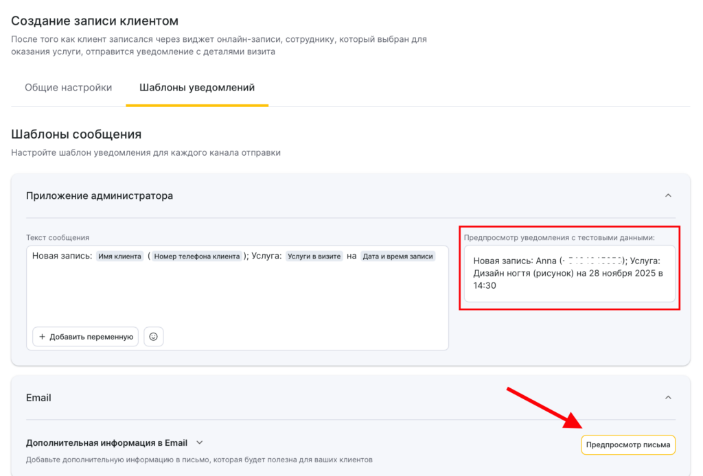 Для всех шаблонов уведомлений доступен предпросмотр — как будет выглядеть сообщение при отправке клиенту, сотруднику или администратору, с учетом переменных.