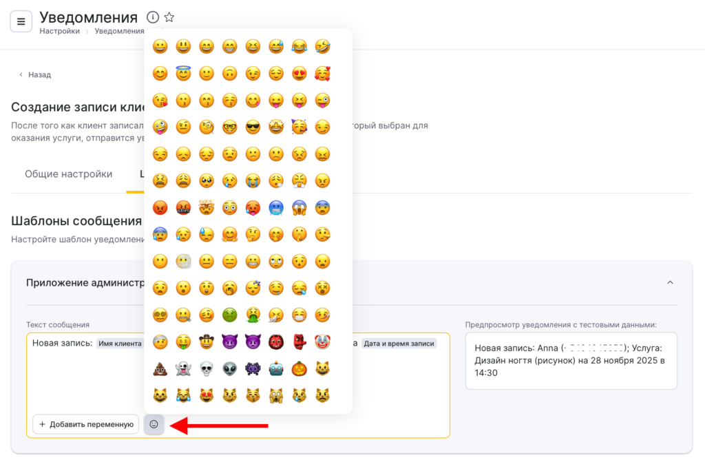В SMS-шаблонах уведомлений вы можете использовать Emoji смайлы, для этого нажмите на кнопку со смайлом и выберете нужный из предложенных или добавьте свой.