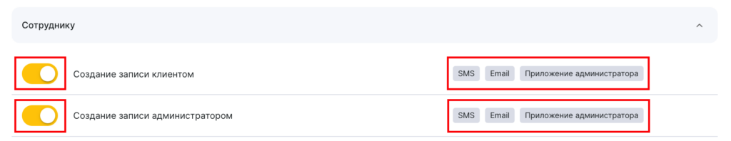 - В блоке Сотруднику выберите тип Создание записи клиентом/Создание записи администратором, нажав на название уведомления или иконку карандаша.