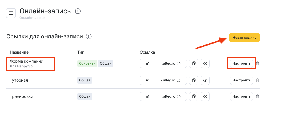 2. Выберите нужную ссылку онлайн-записи, нажмите ее название или кнопку Настроить, чтобы перейти в режим редактирования.