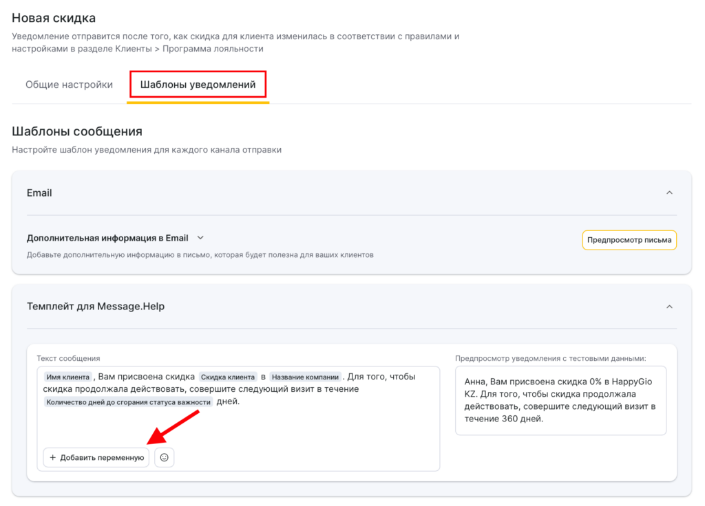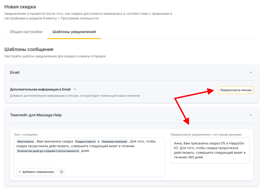 Для всех шаблонов уведомлений доступен предпросмотр — как будет выглядеть сообщение при отправке клиенту, сотруднику или администратору, с учетом переменных.