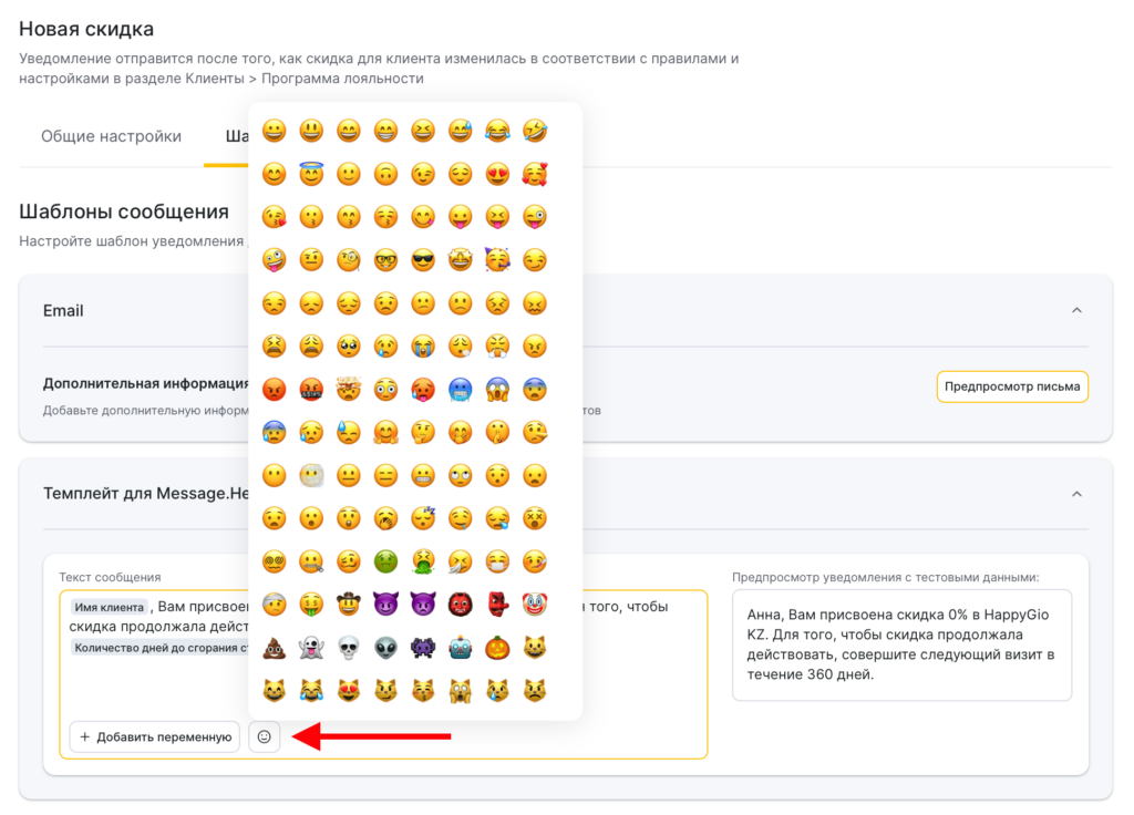 В SMS-шаблонах уведомлений вы можете использовать Emoji смайлы, для этого нажмите на кнопку со смайлом и выберете нужный из предложенных или добавьте свой.