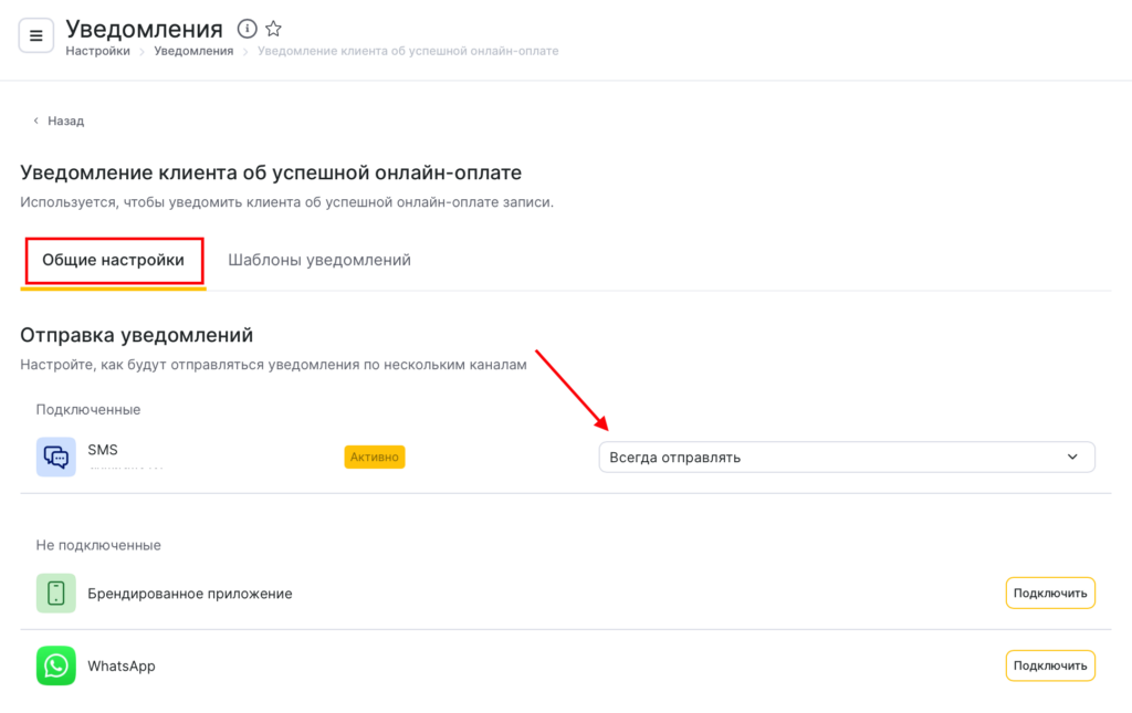 - В блоке Клиенту > Другое выберите тип Уведомление клиента об успешной онлайн-оплате, нажав на название уведомления или иконку карандаша.