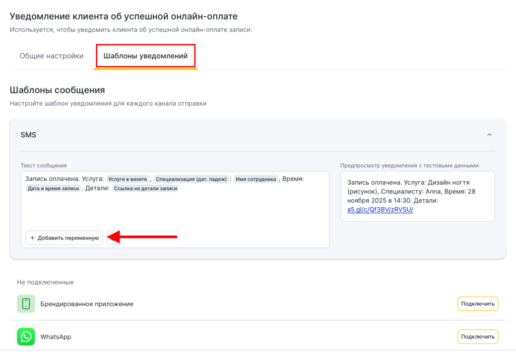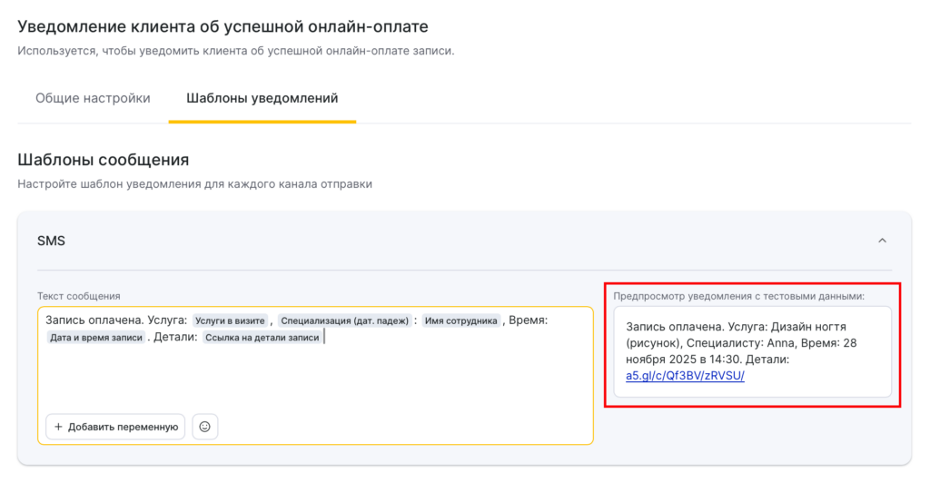 Как будет выглядеть сообщение при отправке клиенту с учетом переменных вы можете увидеть в окне предпросмотра уведомления.
