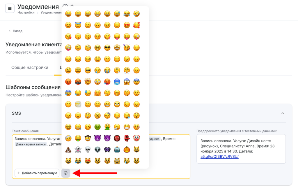 В SMS-шаблонах уведомлений вы можете использовать Emoji смайлы, для этого нажмите на кнопку со смайлом и выберете нужный из предложенных или добавьте свой.