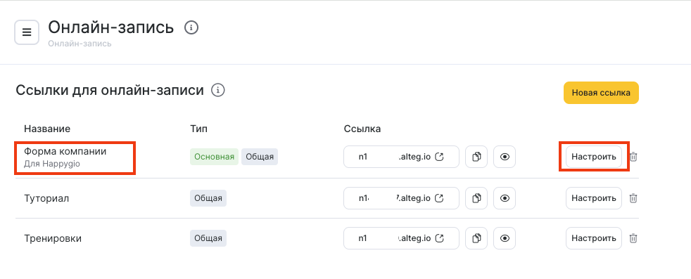 - Чтобы найти поле «Meta (Facebook) Pixel» в Altegio, перейдите в раздел Онлайн-запись > Ссылки на онлайн запись, выберите нужный виджет, нажав на название или кнопку Настроить.