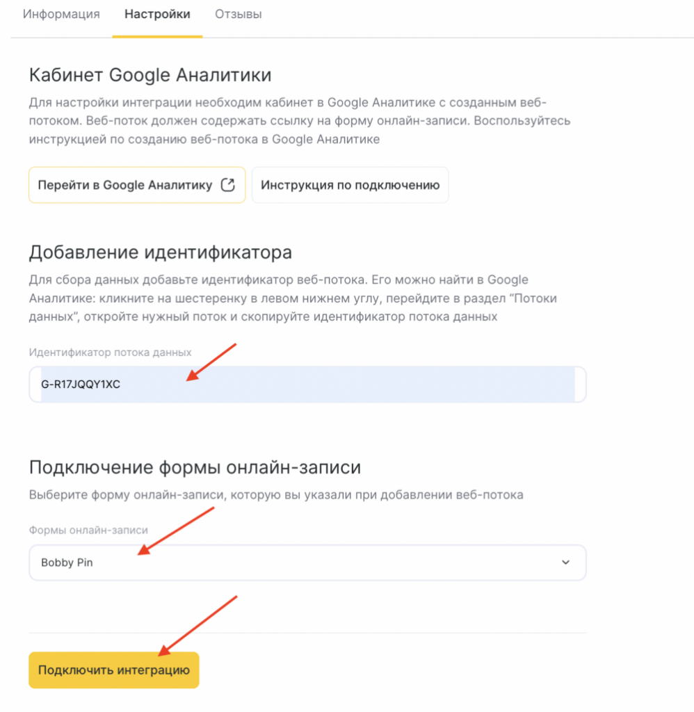 - Ниже выберите из списка форму для онлайн-записи, к которой хотите подключить Google Аналитику.