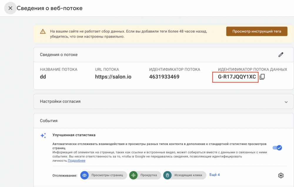 Скопируйте Идентификатор потока данных из окна сведений о веб-потоке. Идентификатор имеет формат G-R17JQQY1XC.