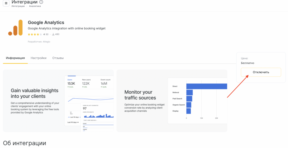- В Altegio перейдите в раздел Интеграции > Аналитика и выберите приложение Google Аналитика.
