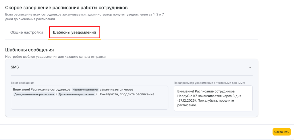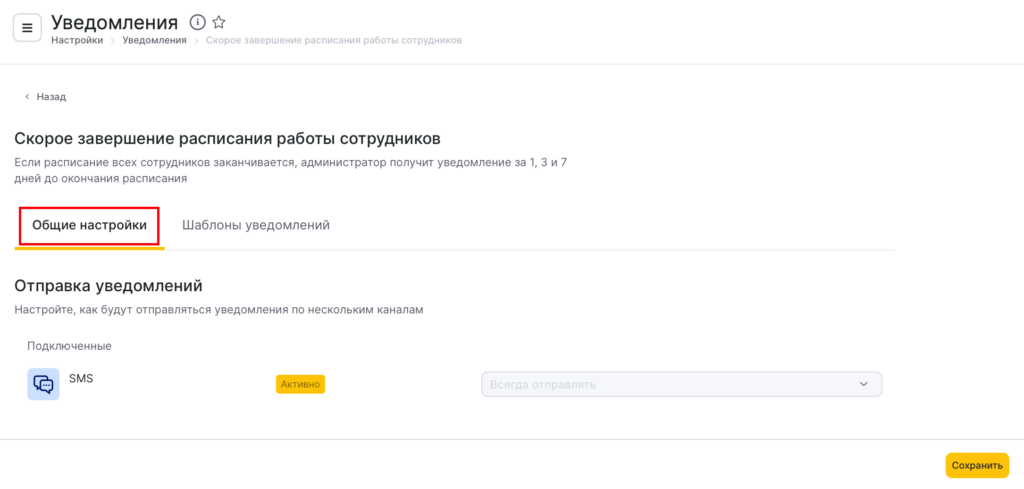 - В блоке Администратору выберите тип Скорое завершение расписания работы сотрудников, нажав на название уведомления или иконку карандаша.