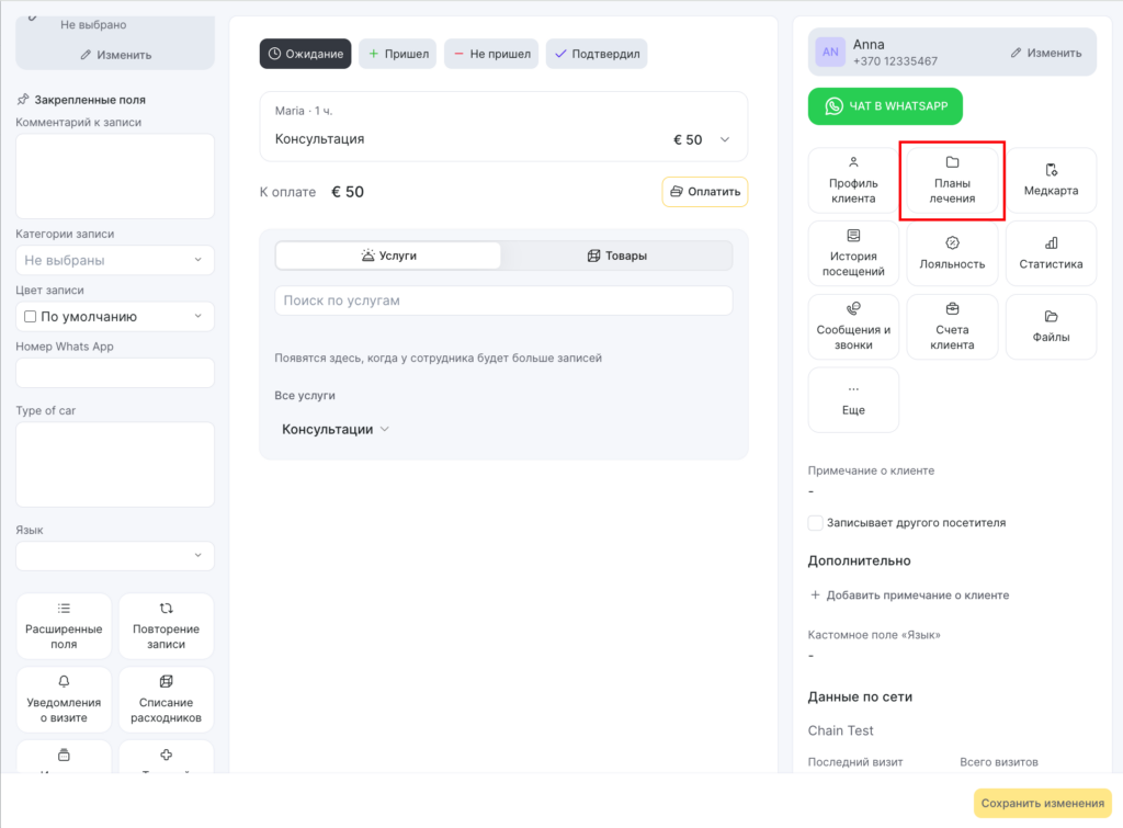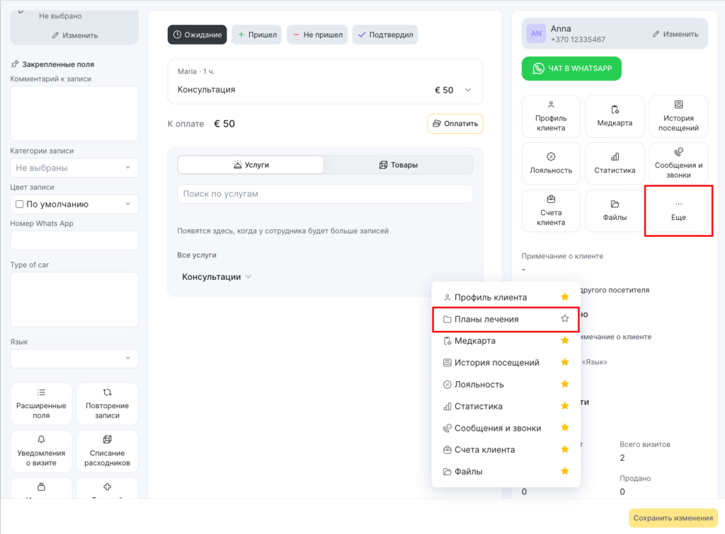 - Перейдите в окно записи пациента и откройте раздел Планы лечения. Для этого нажмите на кнопку Еще в блоке работы с клиентом.