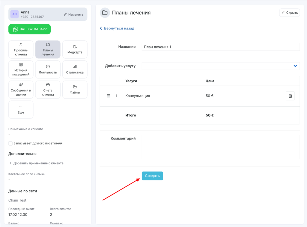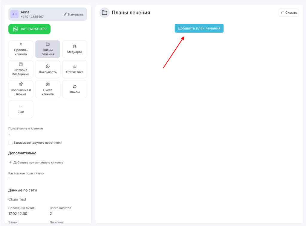 - Нажмите кнопку Добавить план лечения.