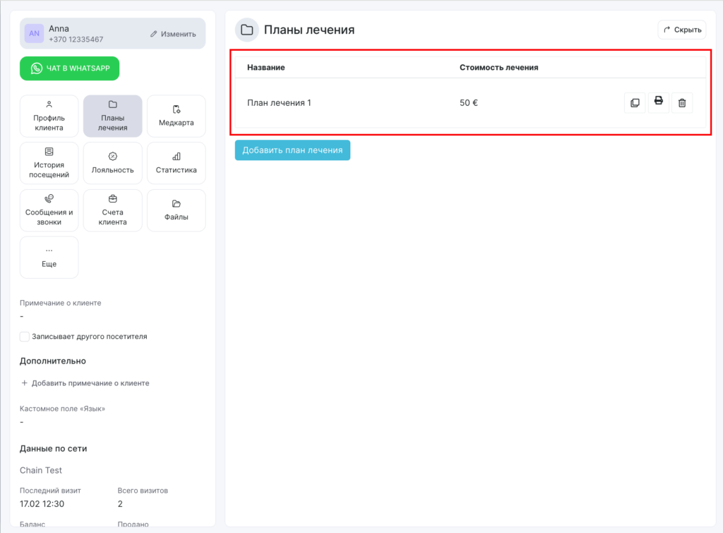 Сохраненный план лечения можно скопировать, распечатать или удалить. В этом же разделе вы можете просмотреть все планы лечения, составленные для пациента.