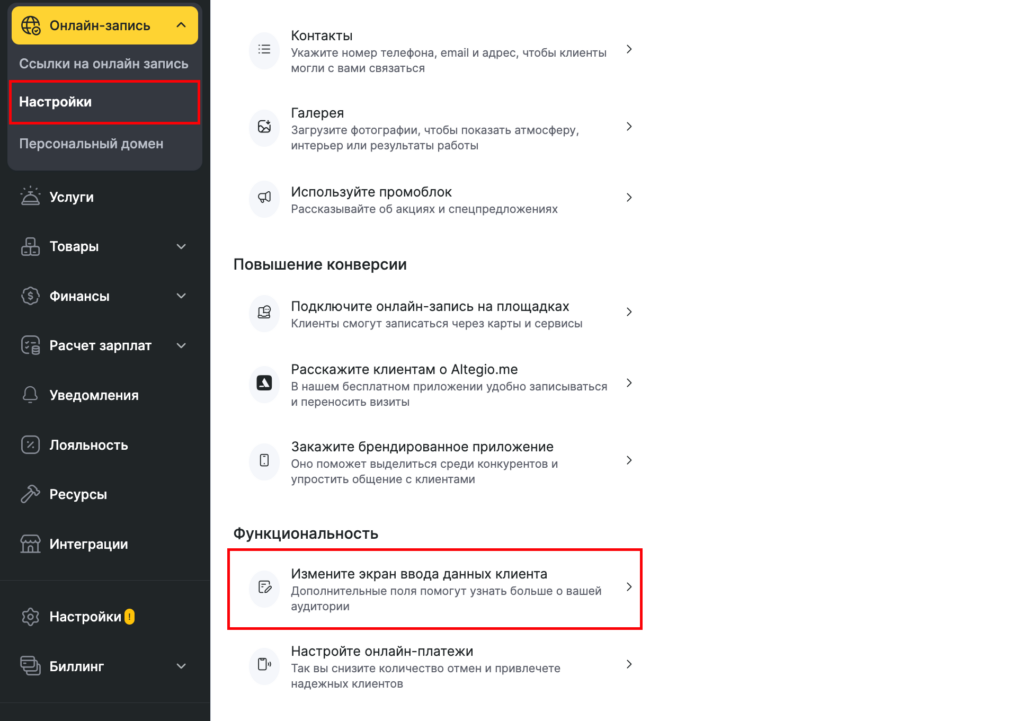 В режиме Администрирование перейдите в раздел Онлайн-запись > Настройки > Изменить экран ввода данных клиента.