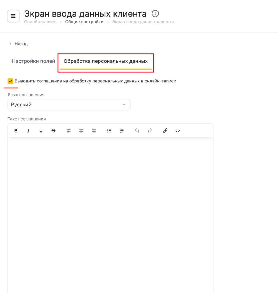 Откройте вкладку Обработка персональных данных и поставьте галочку, чтобы включить отображение соглашения на обработку персональных данных в онлайн-записи.