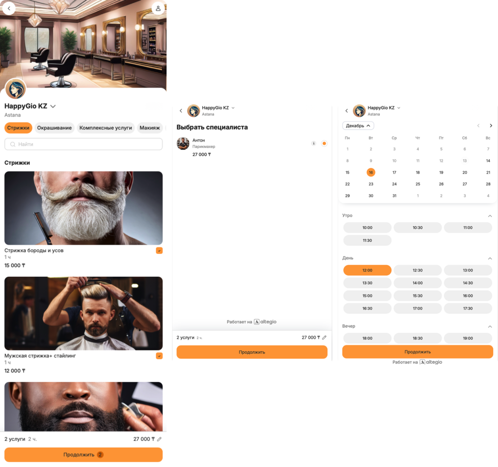 - Короткий пошаговый – в этом сценарии клиент всегда выбирает сначала услугу, затем сотрудника, после дату и время. В этом формате изменение порядка шагов недоступно. В остальном принцип записи такой же, как и в пошаговом формате, но с небольшими визуальными отличиями на шаге выбора сотрудника и даты и времени.