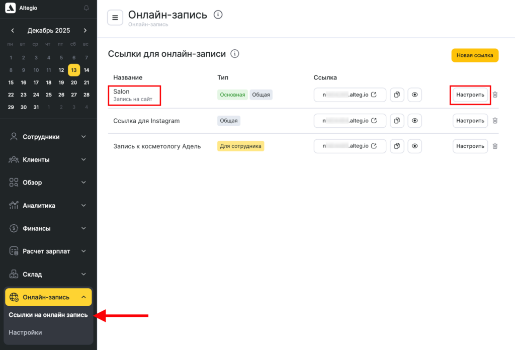 - Перейдите в раздел Онлайн-запись > Ссылки на онлайн запись.