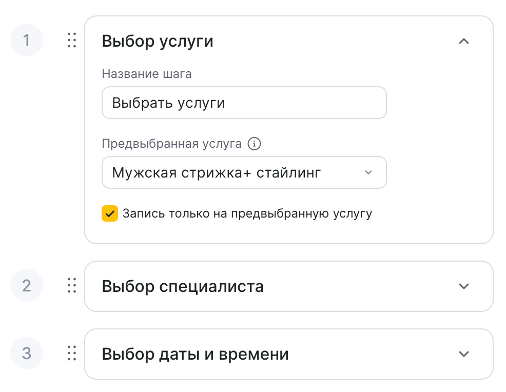 Чтобы изменить порядок шагов, нажмите и удерживайте кнопку с точками слева от названия шага, затем перетащите его в нужное место. Выбранная последовательность будет отображаться в виджете онлайн-записи.
