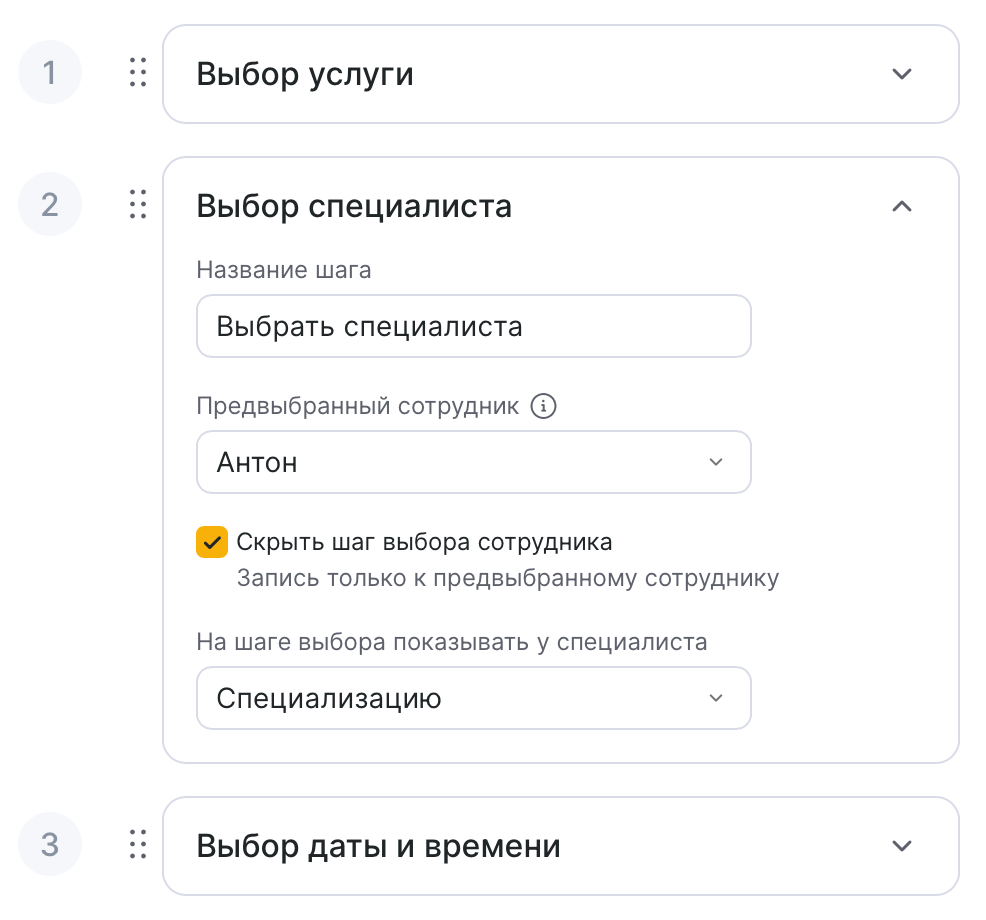Также вы можете скрыть шаг выбора сотрудника, таким образом запись будет назначена предвыбранному сотруднику без возможности выбрать другого.