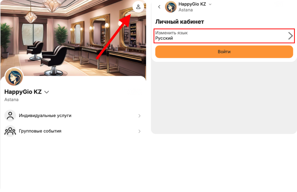 Возможность выбора языка есть и в самом виджете онлайн-записи. Для этого нужно перейти в ваш Личный кабинет, нажав на иконку профиля 👤 в правом верхнем углу экрана и нажать кнопку Изменить язык.