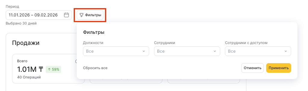 В блоке Продажи отображаются данные по выручке и средним показателям.