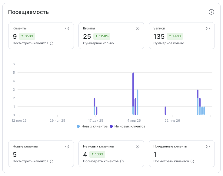 Блок Посещаемость отражает активность клиентов за выбранный период и помогает оценить динамику визитов и клиентской базы.
