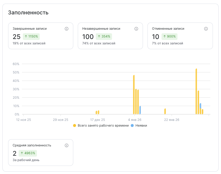 Средняя заполненность — показатель отражает средний процент загрузки сотрудников за рабочий день. Рассчитывается как: Суммарная продолжительность записей со статусом «Клиент пришёл»÷Суммарная продолжительность рабочего времени сотрудников. Показатель помогает понять, насколько эффективно используется рабочее время команды.