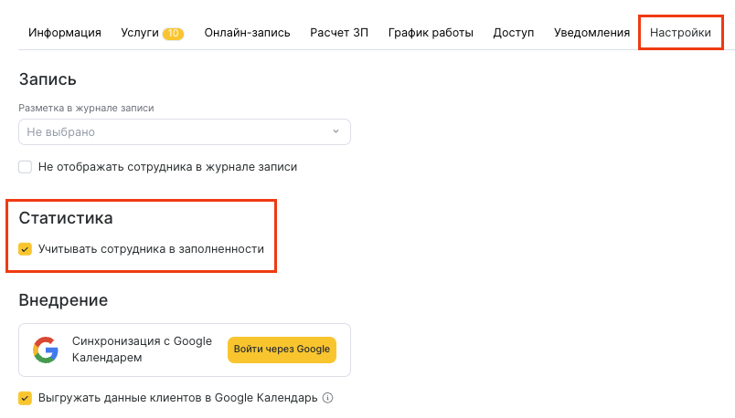Исключить таких сотрудников из статистики можно, если снять галочку в настройках сотрудника в поле Статистика > Учет в заполненности (подробнее об этом в статье, пункт Статистика).