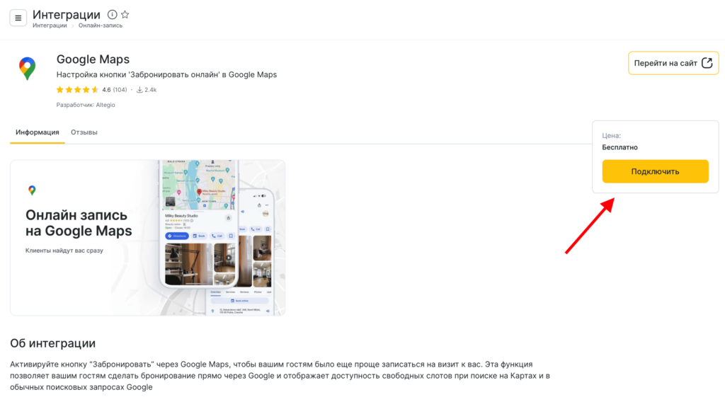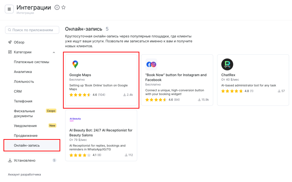 - В разделе Онлайн-запись выберите интеграцию с Google Maps.