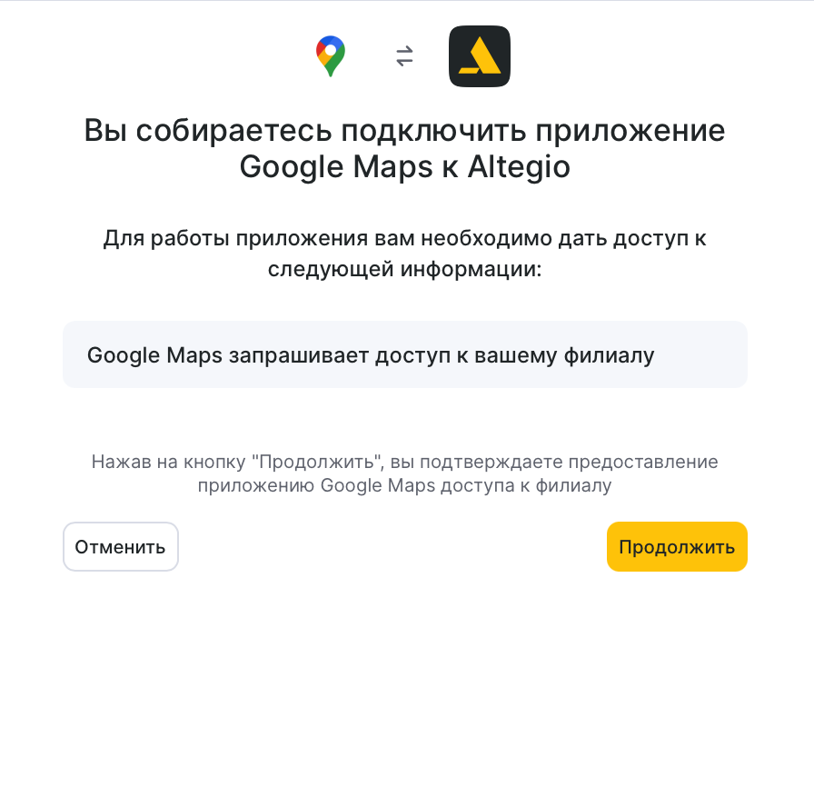 - На открывшейся странице подтвердите предоставление доступа к вашему филиалу, нажав кнопку Продолжить.