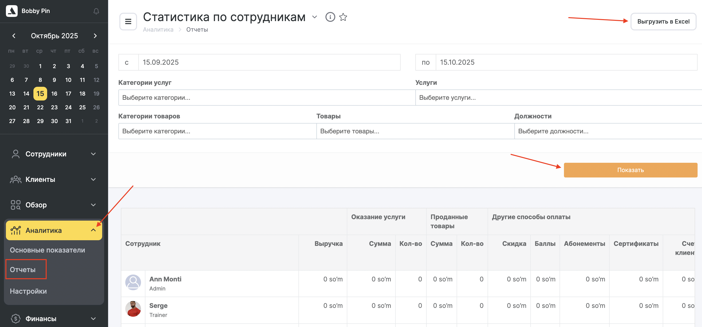 Раздел «Аналитика» > «Отчеты» > «По сотрудникам» показывает, какую выручку приносит каждый сотрудник за определенный период времени и по каким показателям.