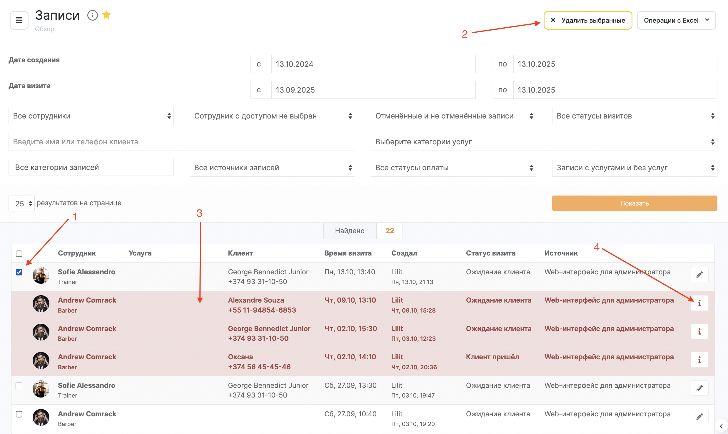 Если у пользователя нет прав на удаление оплаченных записей или записей в статусе «Клиент пришел», то такие записи удалены не будут, о чем пользователь будет оповещен после нажатия на кнопку «Удалить выбранные».