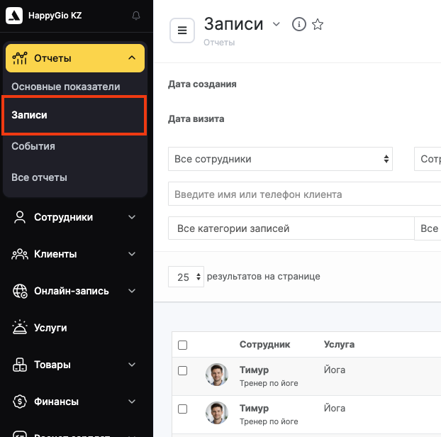 Раздел содержит информацию о том, какие записи и за какой период были сделаны, кто именно их сделал (администратор или клиент), информацию об источнике онлайн-записи, к какому сотруднику, на какую услугу была запись, данные клиента и т.д.