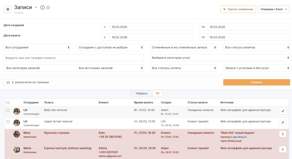 Если у сотрудника нет прав на удаление оплаченных записей или записей в статусе «Клиент пришел», то такие записи удалены не будут, о чем сотрудник будет оповещен после нажатия на кнопку «Удалить выбранные».