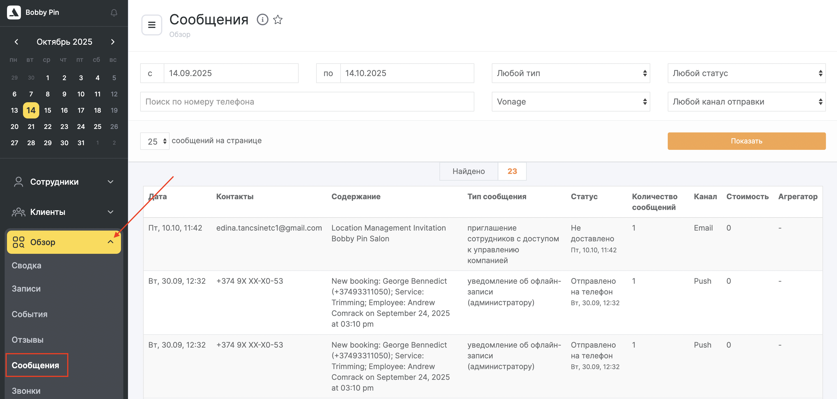 В разделе «Обзор» > «Сообщения» представлена информация обо всех сообщениях, которые отправлялись клиентам, администраторам, сотрудникам.