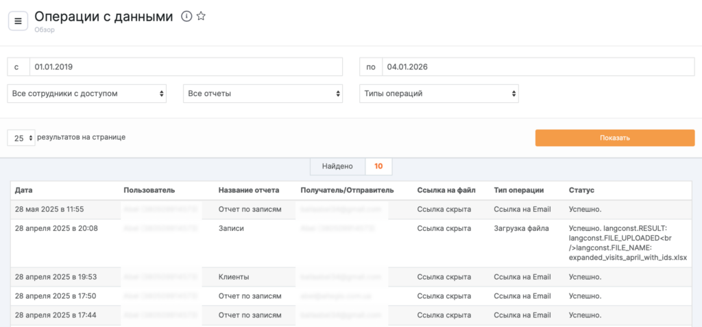 В разделе Обзор > Операции с данными вы можете найти лог всех выгрузок из разделов: