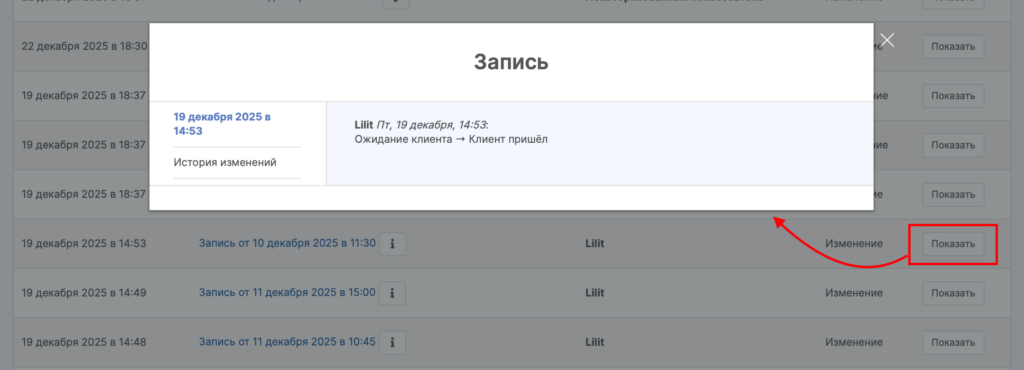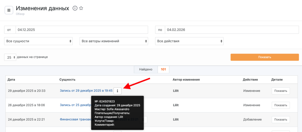 В столбце Детали можно просмотреть информацию о записи или операции и историю всех изменений по ним. Для этого нажмите кнопку Показать напротив интересующей вас операции.