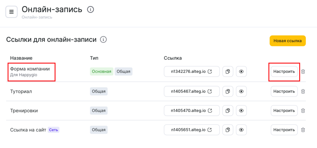 - Нажмите на название нужной формы или на кнопку Настроить. При необходимости добавьте новую форму (как это сделать, читайте в статье Настройка и возможности онлайн-записи).