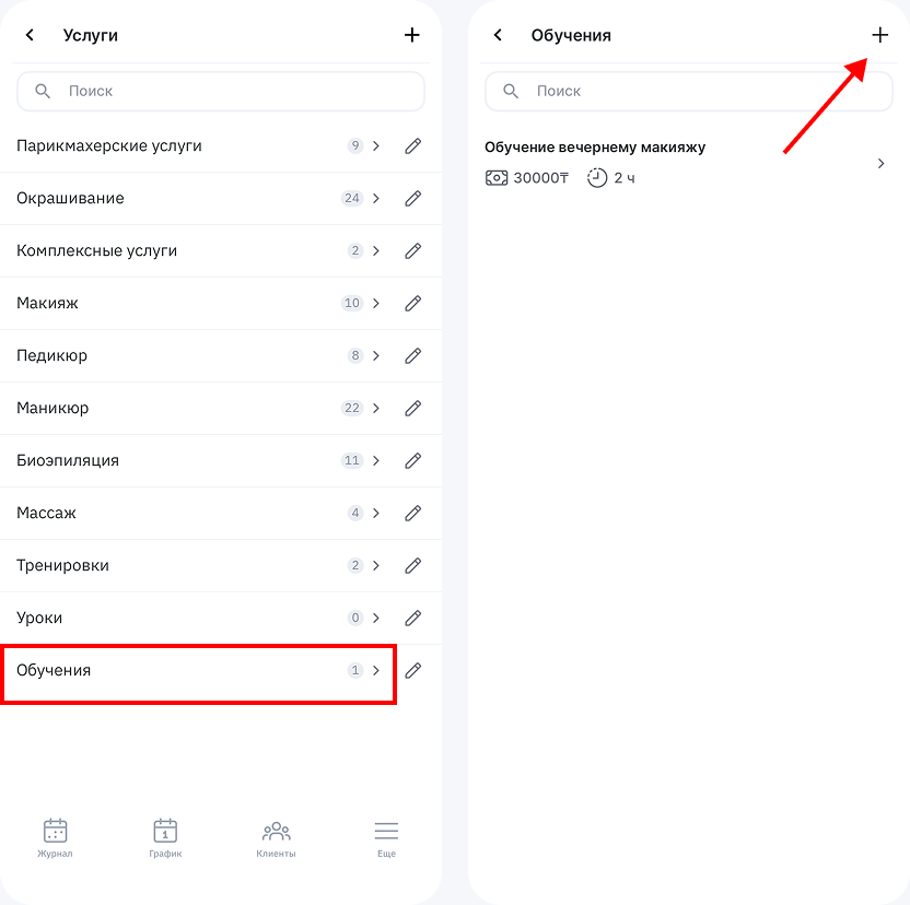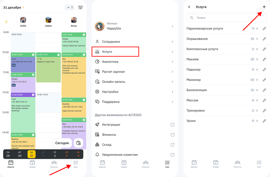 Если в веб-версии вы уже создали услуги и категории услуг, сотрудников, настроили график работы и начали вести запись в журнале, то сможете увидеть все это и в мобильном приложении. При этом вы также можете создавать, настраивать, редактировать и удалять данные об услугах в мобильном приложении.