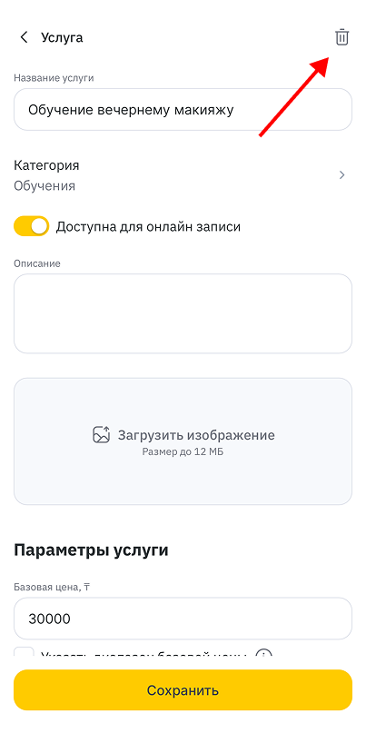 - Чтобы удалить услугу, нажмите на кнопку с изображением корзины в правом верхнем углу.