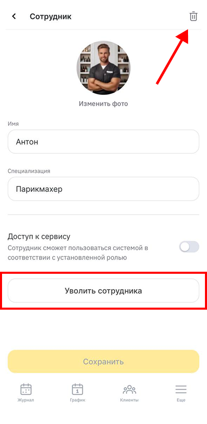 - Чтобы удалить сотрудника и все данные о нем, нажмите на кнопку с изображением корзины в правом верхнем углу.