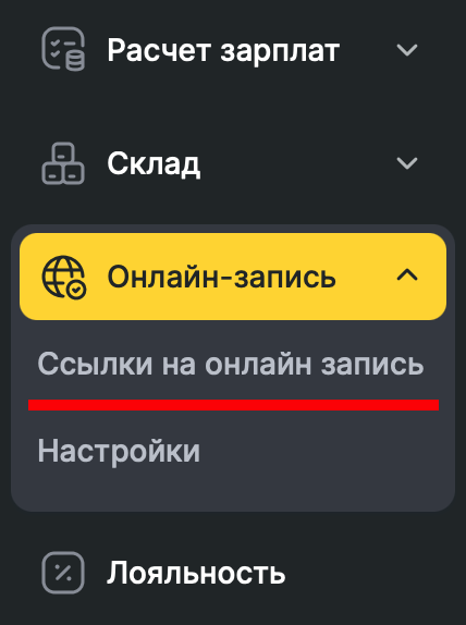 - В основном меню Altegio перейдите в раздел Онлайн-запись > Ссылки на онлайн запись.