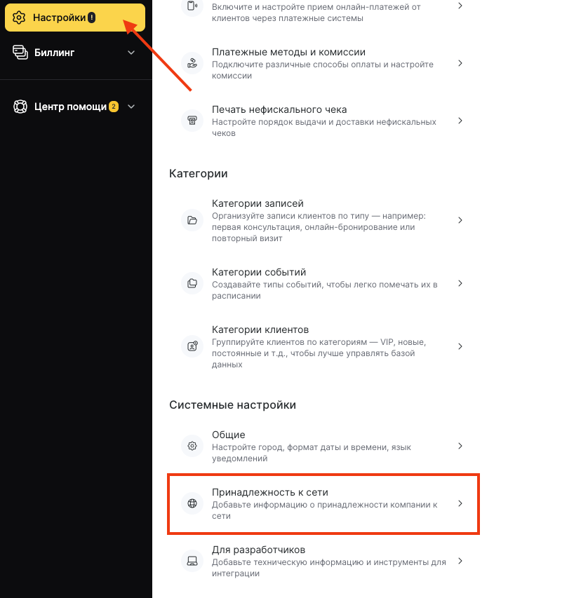 Altegio автоматически направит вас на страницу управления сетью в раздел Настройки > Основные (в сетевом интерфейсе).