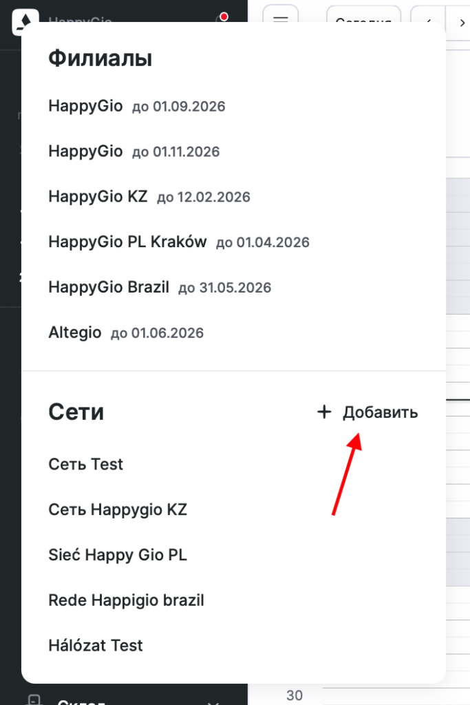 - Нажмите на название филиала (или сети, если вы находитесь в интерфейсе уже созданной сети) и в выпадающем меню в блоке Сети нажмите Добавить.